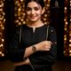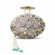 Golden flowers with pearl centres bloom across the surface, while champagne and gold teardrop-shaped crystals add dimensional beauty. Iridescent purple-pink teardrop accents provide subtle colour shifts that catch the light magnificently. The rigid frame construction ensures durability and perfect shape retention, while the ornate handle features a golden floral design with turquoise stone and pearl embellishments.